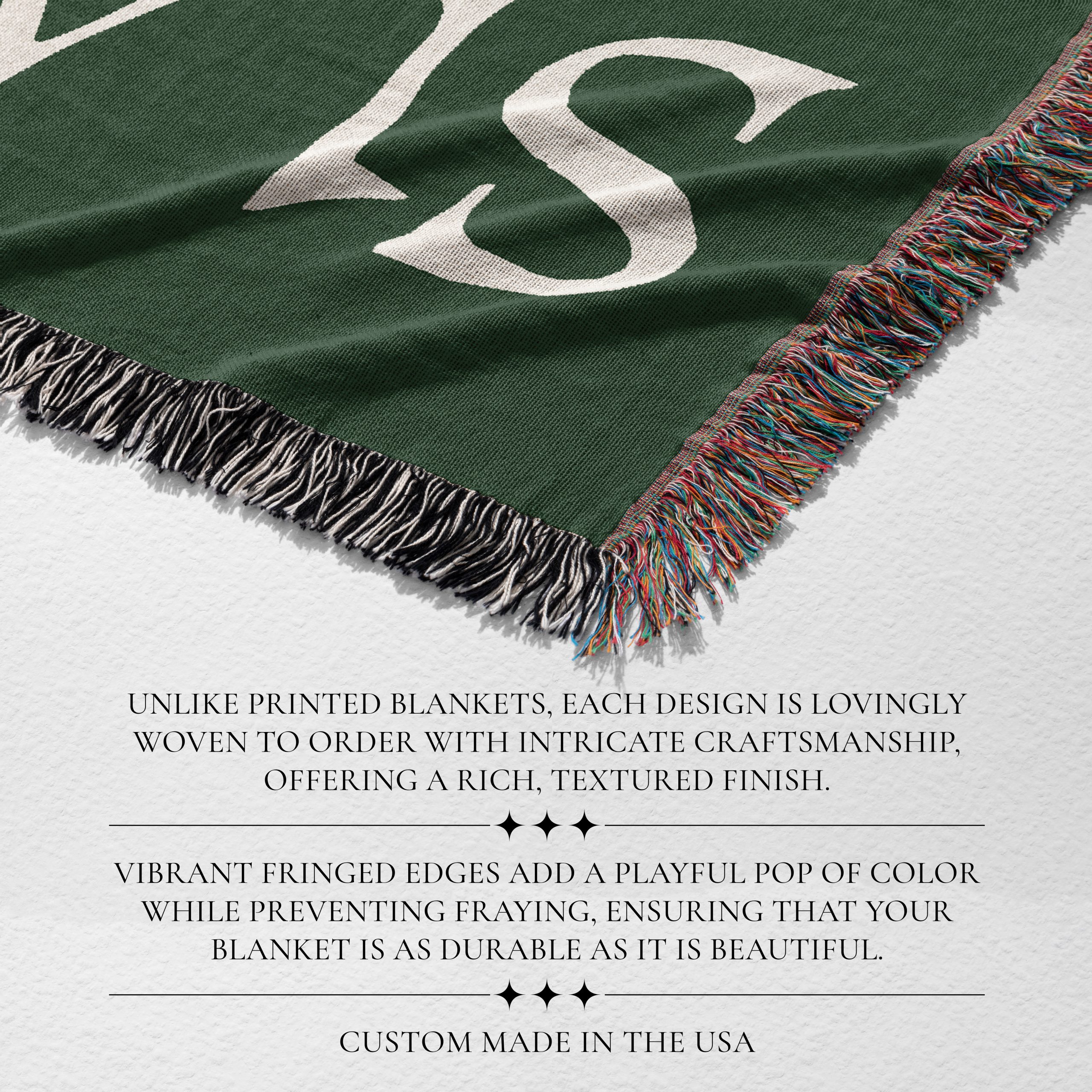 Unlike printed blankets, each design is lovingly woven to order with intricate craftsmanship, offering a rich, textured finish. The vibrant fringed edges add a playful pop of color while preventing fraying, ensuring that your blanket is as durable as it is beautiful.
